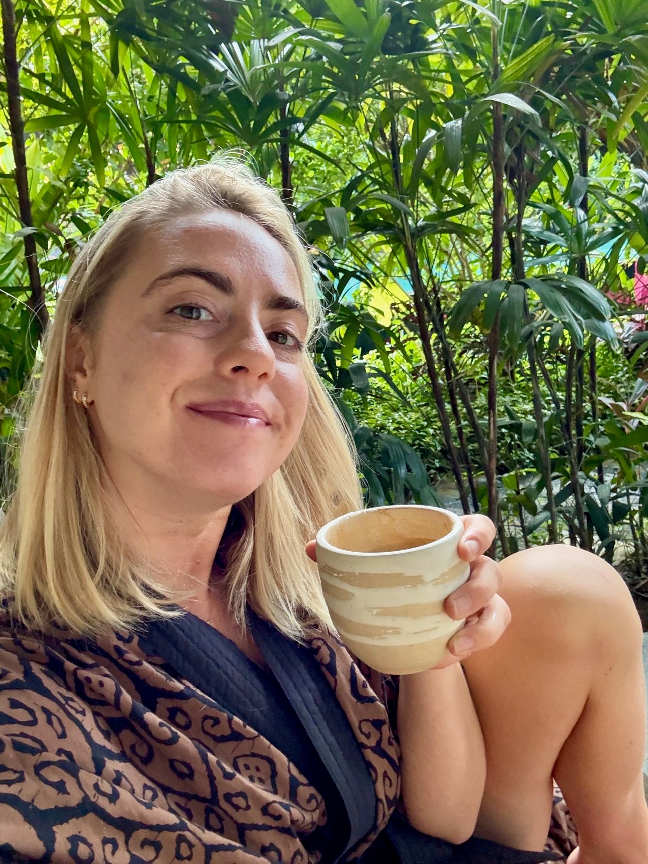 Enjoying a morning coffee ritual after meditation surrounded by Bali's lush vegetation ā one of the many mindful moments that punctuated each day.