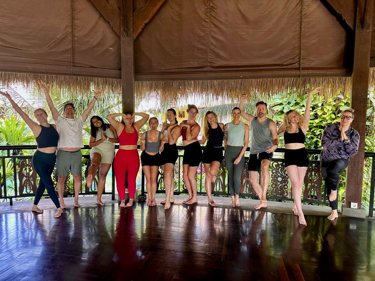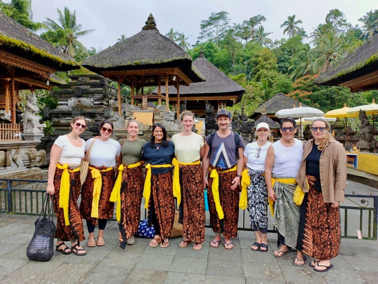 Our yoga retreat group in traditional sarongs at the temple. The vibrant yellow sashes signify purity and are required for temple visits.