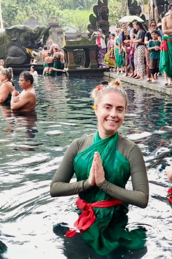 Participating in the sacred water purification ritual at Tirta Empul. This moment of prayer in the holy waters was when the rain began ā a blessing from Indra.