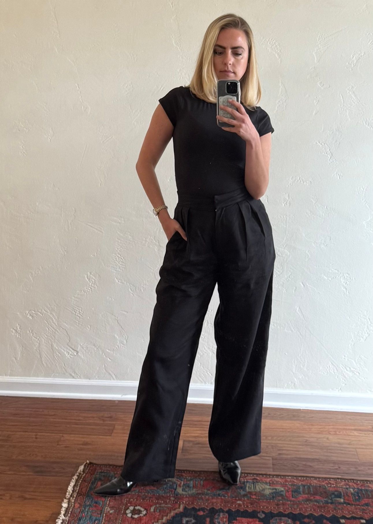 Vuori black fitted tshirt, linen slacks from Net-a-Porter, Italian leather heeled boots.